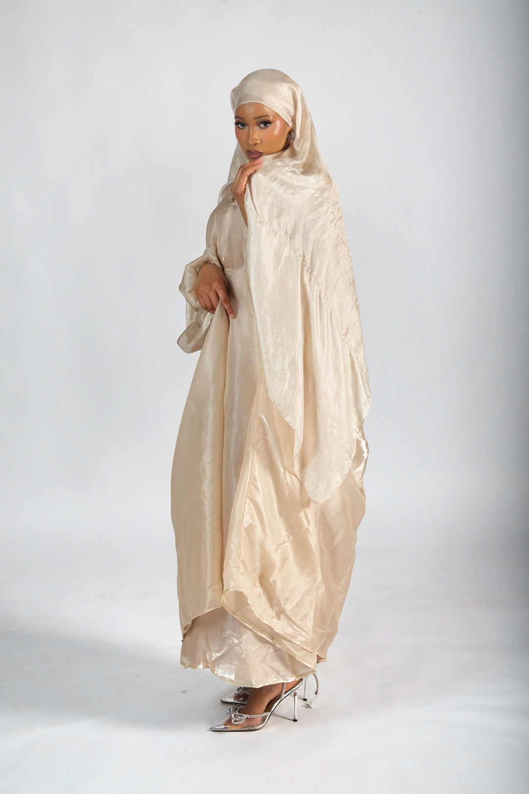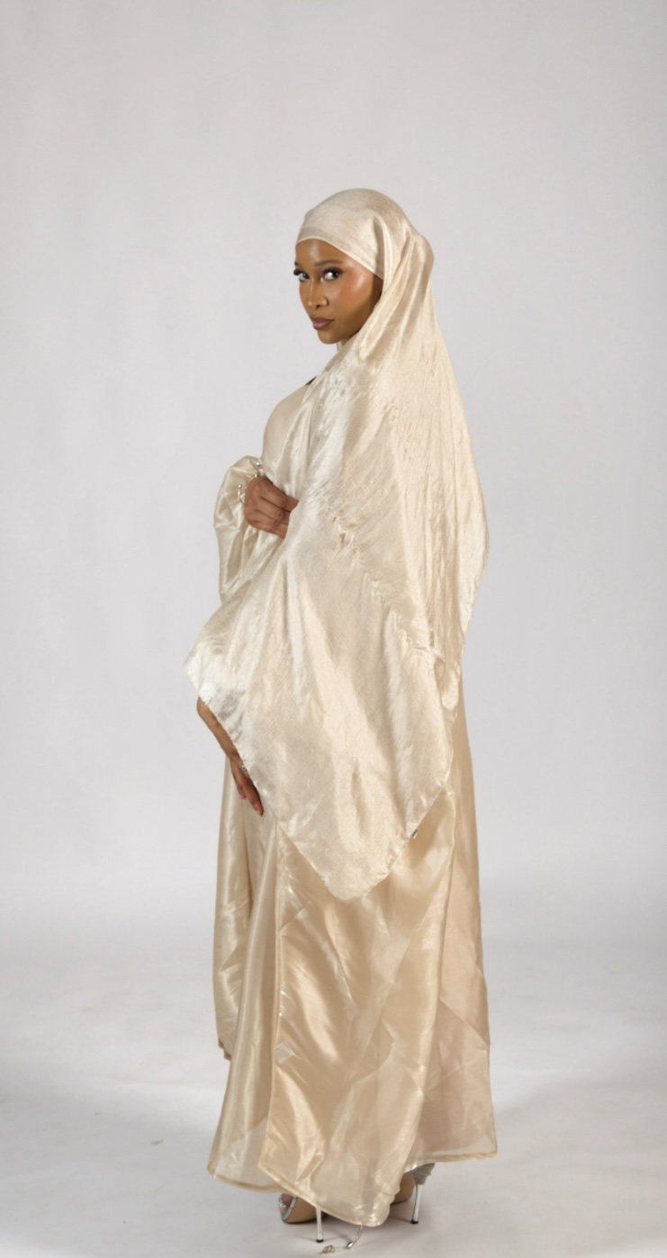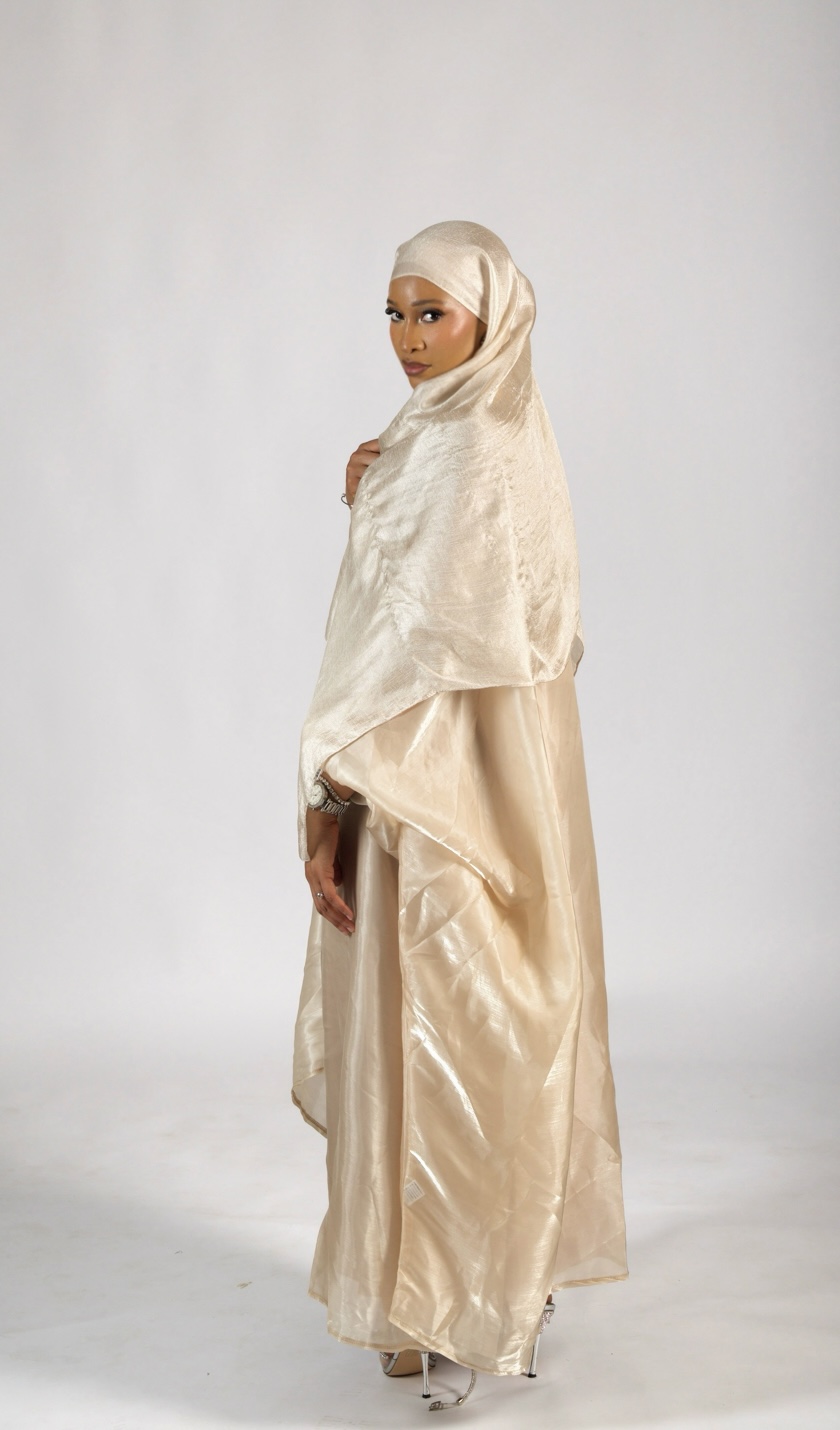 La sous-abaya forme une base douce, fluide, confortable et parfaitement opaque, idéale à porter seule ou en superposition. Par-dessus, la abaya extérieure en tissu fluide et légèrement brillant apporte éclat et élégance à chaque mouvement.
