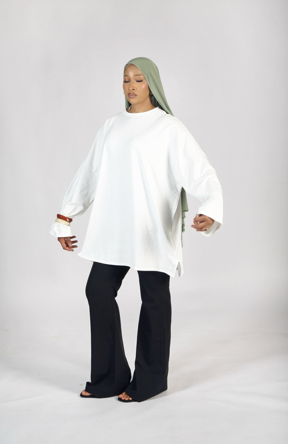 T-shirt oversize blanc long en coton doux, doté de deux fentes latérales pour un style fluide et un confort maximal.